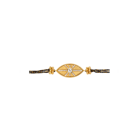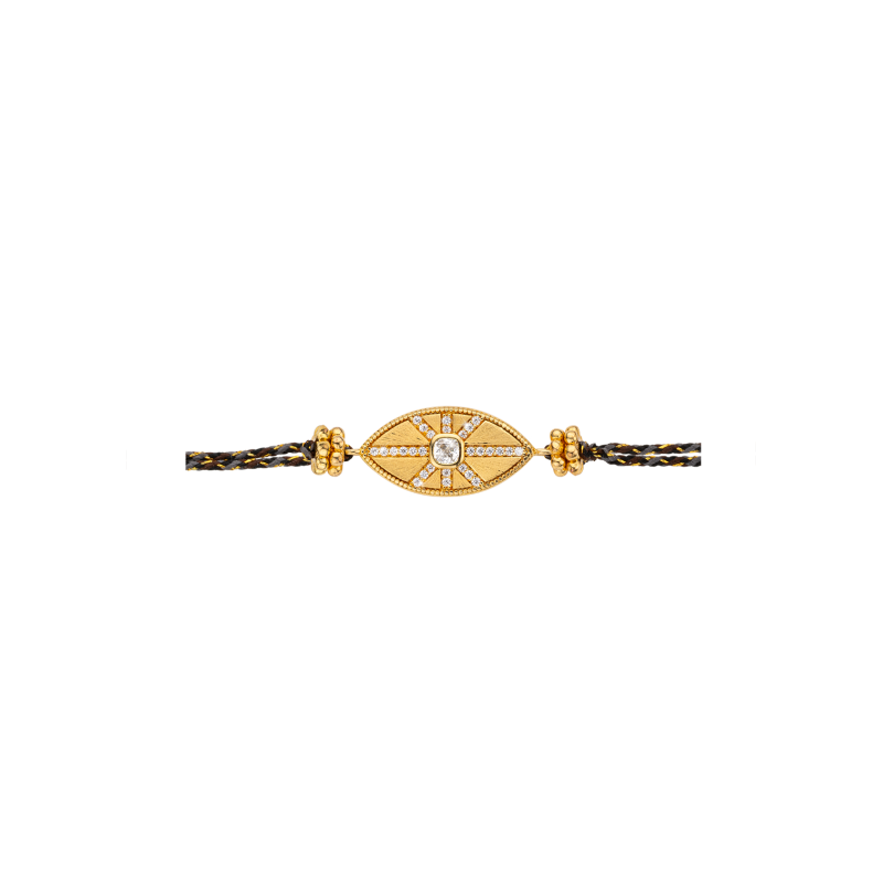 Monté sur un cordon noir tissé de fils dorés, il met en valeur un strass blanc éclatant en son centre, comme une lumière précieuse qui accroche le regard. À la croisée de la douceur californienne et de la force symbolique de la collection ROUND ONE, il s’affirme sans en faire trop.
