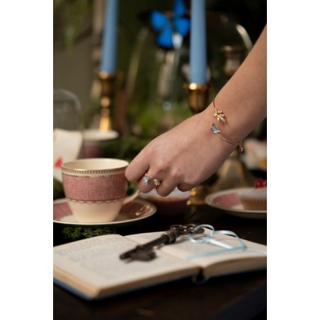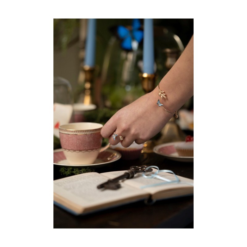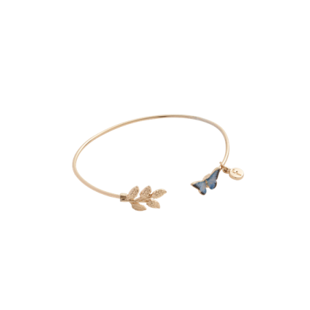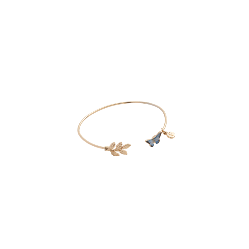 Étreinte de la nature. Incarnant l’essence de la liberté et du renouveau, ce bracelet jonc orné d’un papillon bleu et d’une feuille d’or s’inspire d’illustrations botaniques vintage et de curiosités victoriennes.