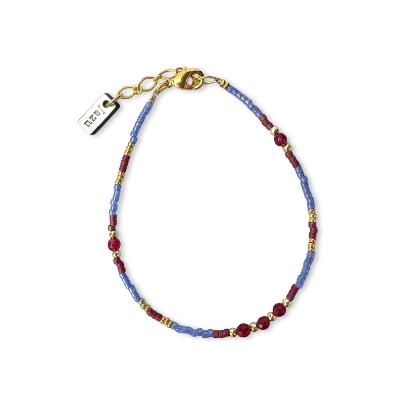 Bracelet en petites perles de verre serties de pierres semi-précieuses, fermoir et chaînette d'extension plaqués or, fait main. ± 15-18 cm