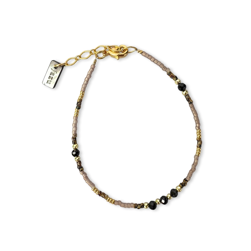 Bracelet en petites perles de verre serties de pierres semi-précieuses, fermoir et chaînette d'extension plaqués or, fait main. ± 15-18 cm