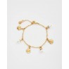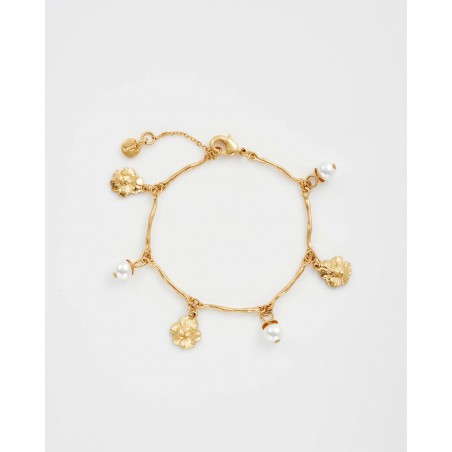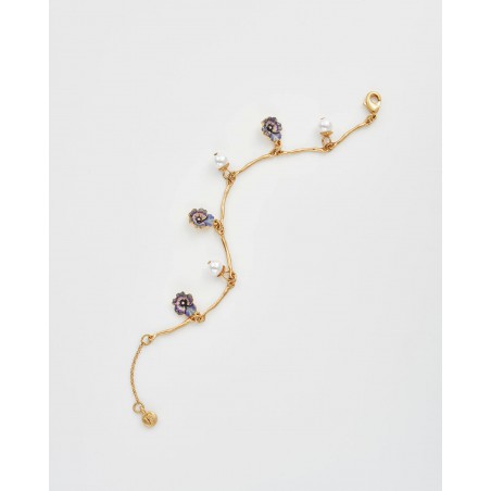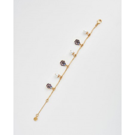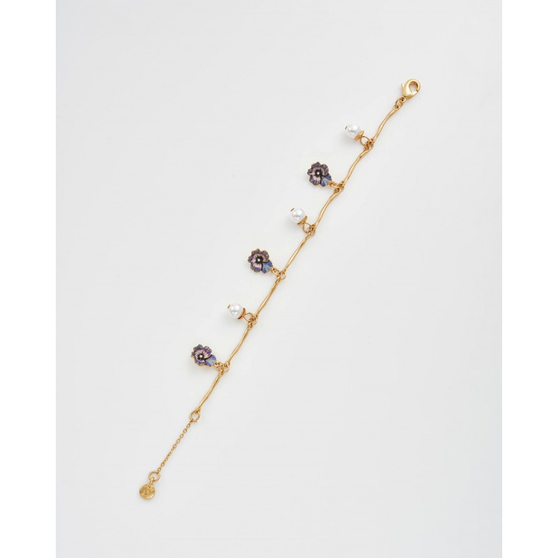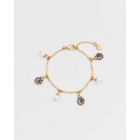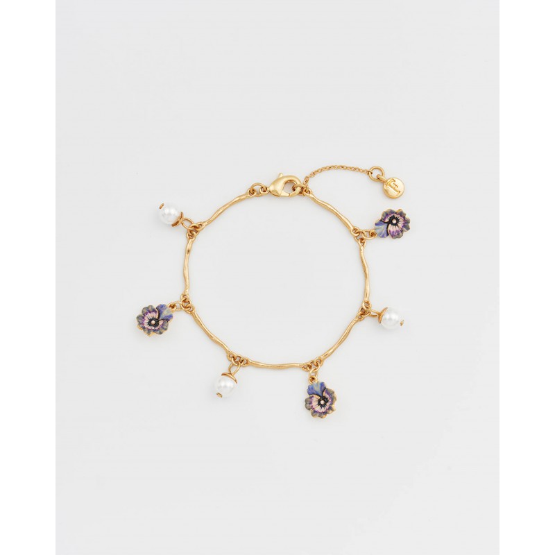 Le bracelet à breloques Pensée et Perles en Or Multi capture l'esprit joyeux du printemps en pleine floraison. Cinq breloques pensées peintes à la main dans des tons lilas et violet alternent avec des perles d'imitation brillantes sur une chaîne en plaqué or 22 carats à la texture douce et vieillie. Le travail d'émail délicat et le subtil éclat de l'or font de ce bracelet un symbole d'élégance et d'optimisme, une pièce intemporelle pour celles et ceux qui trouvent la beauté dans les plus petits détails de la nature.