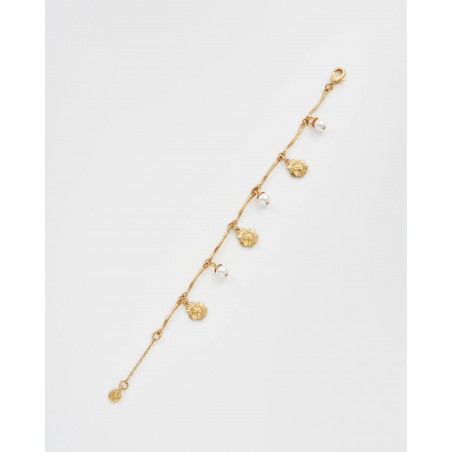 Breloques : laiton plaqué or 22 carats vieilli, alliage de zinc, émail, fausse perle ; Chaîne : laiton plaqué or 22 carats vieilli