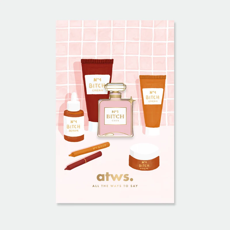 Affichez votre caractère avec le Pin's N°1 Bitch par All The Ways To Say. Inspiré des flacons de parfum iconiques, cet accessoire chic arbore une bouteille rose marquée "N°1 BITCH CLUB", sublimée par une finition en émail doré éclatant. Présenté sur une carte illustrée évoquant une coiffeuse remplie de produits de beauté, ce pin's apporte une touche d'impertinence élégante à votre veste, votre sac ou votre chapeau préféré.