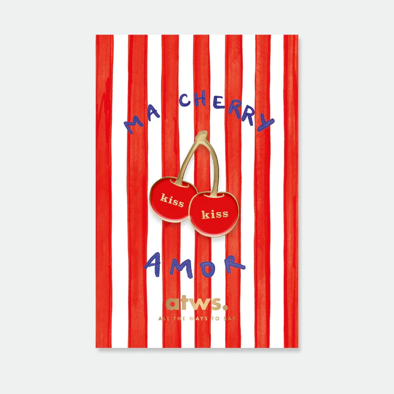 Scellez votre style avec un clin d'œil fruité grâce au Pin's Kiss Kiss par All The Ways To Say. Cet accessoire adorable met en scène deux cerises rouges éclatantes suspendues à une tige dorée, chacune portant l'inscription "kiss" gravée avec malice. Sublimé par une finition en émail doré de haute qualité, il apporte une note "Ma Cherry Amor" à votre veste, votre chapeau ou votre sac. Présenté sur une carte illustrée à rayures rouges et blanches, c'est le petit cadeau idéal pour témoigner de votre affection.