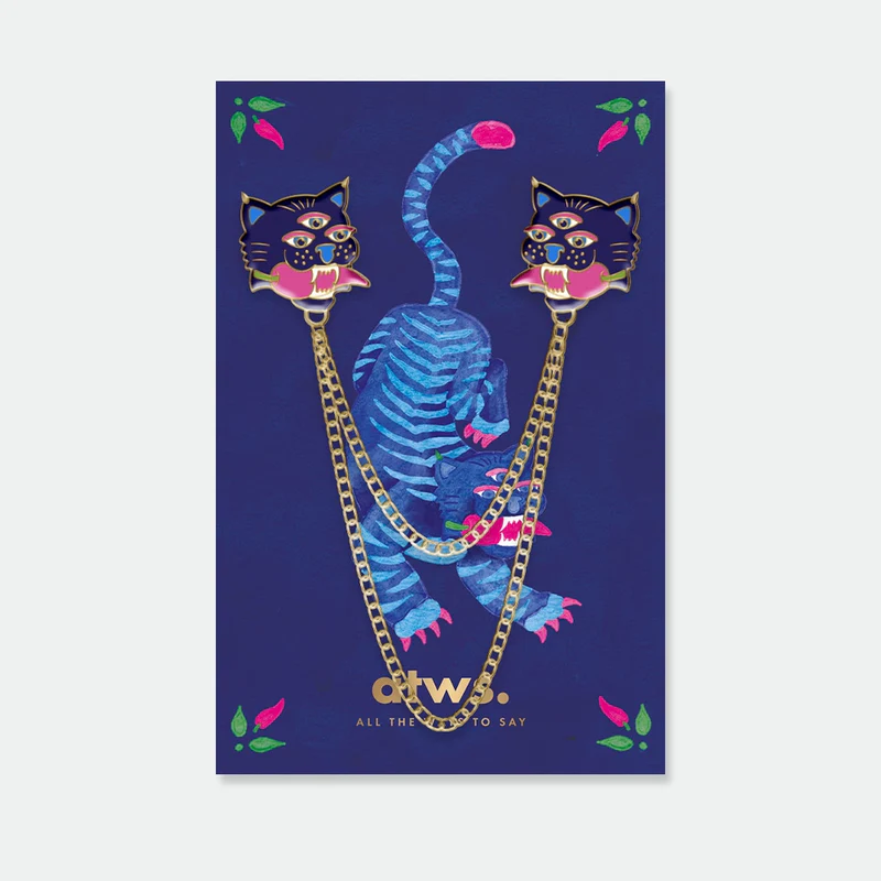 Sublimez votre tenue avec le Pin's Duo Tiger Chain par All The Ways To Say. Cet ensemble unique se compose de deux têtes de tigres bleus fascinantes, chacune arborant un troisième œil mystique et une rose rose entre les crocs. Reliées par deux élégantes chaînes dorées de longueurs différentes, cet accessoire est conçu pour être épinglé sur les cols de chemise, les revers de veste ou même les chapeaux pour un look artistique et audacieux.