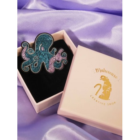 Une magnifique broche Poulpe entièrement brodée à la main en fils cannetille pour les amoureux de l'océan et des animaux marins.