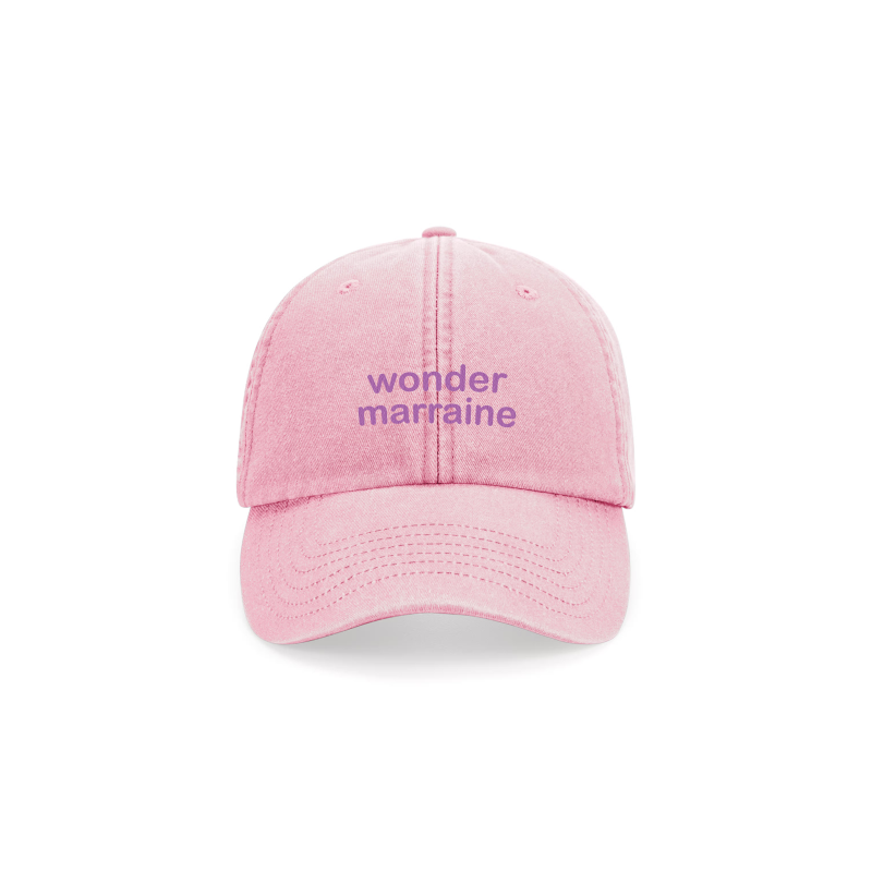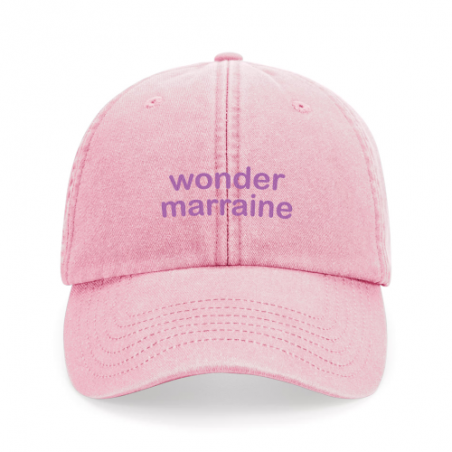 Casquette type baseball vintage rose avec une broderie trendy "wonder marraine" mauve.