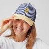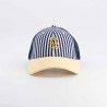 Couleurs : avant rayures bleu marine et crème, visière jaune , filet bleu marine