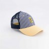 Couleurs : avant rayures bleu marine et crème, visière jaune , filet bleu marine