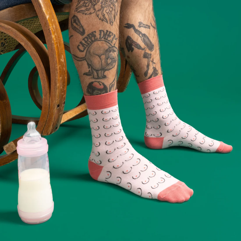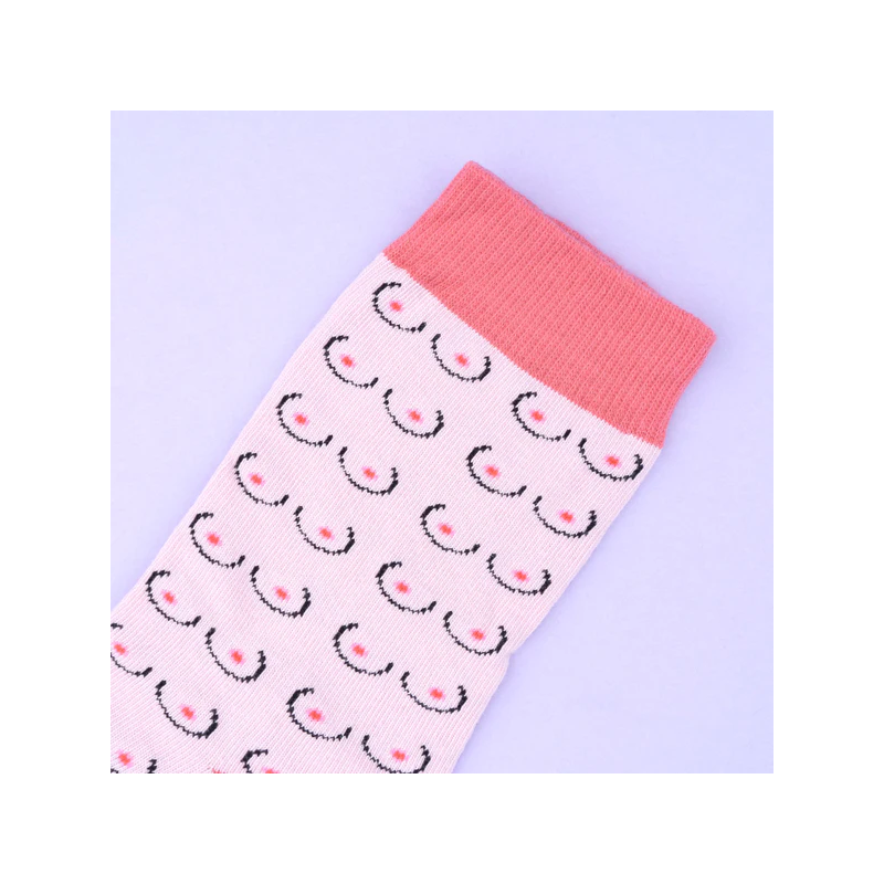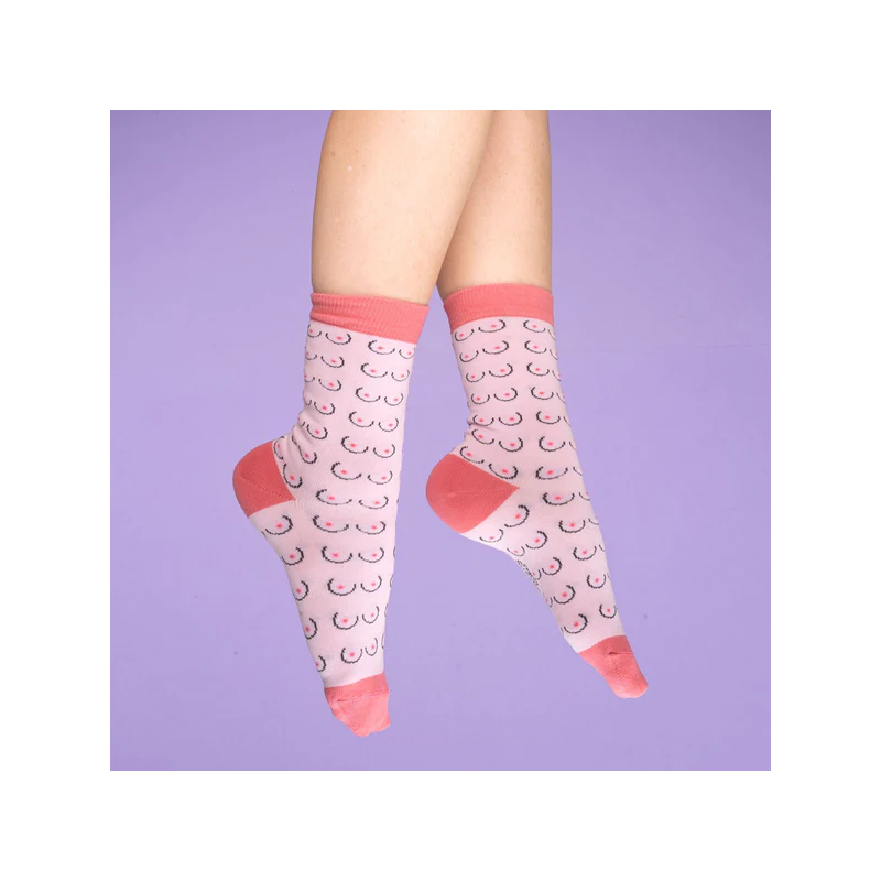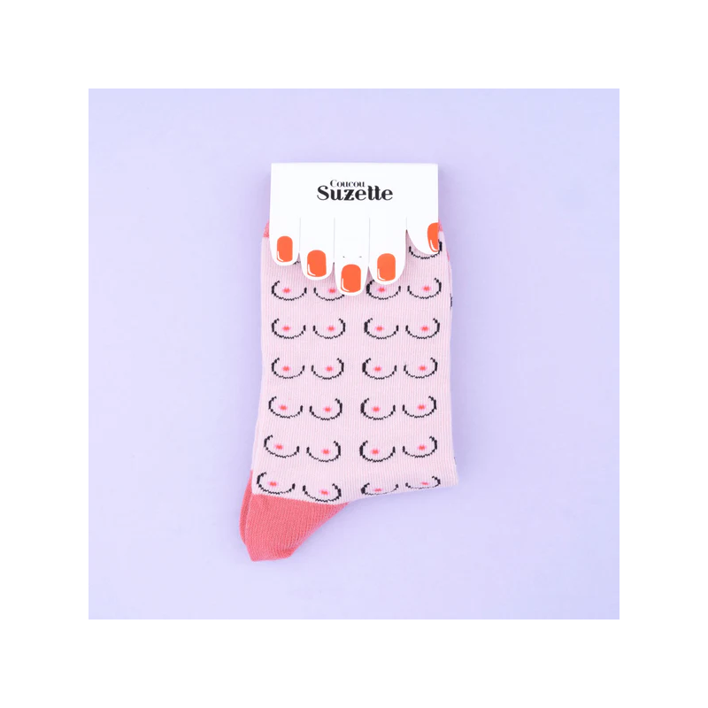 Voici les fameuses chaussettes à motif seins Coucou Suzette : petit cadeau original qui fait rigoler, clin d'œil coquin à laisser dépasser d’une paire de sneakers, bref best-seller absolu ! :)