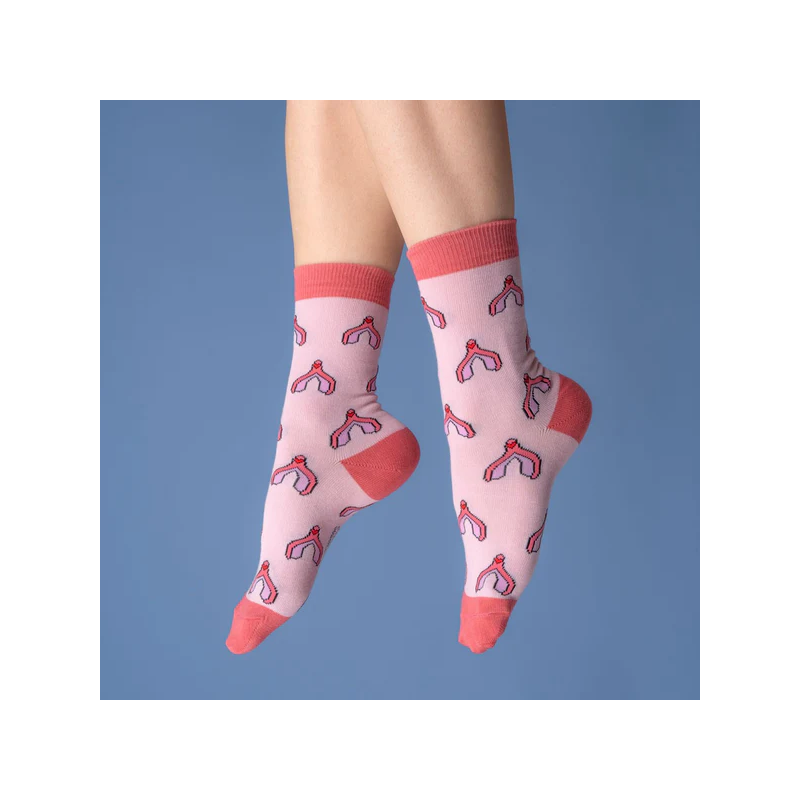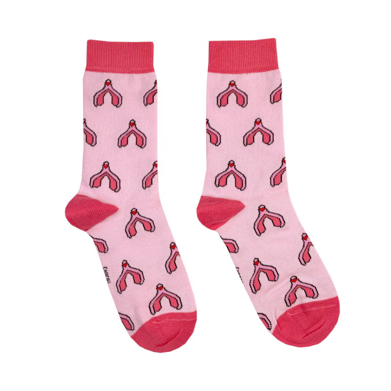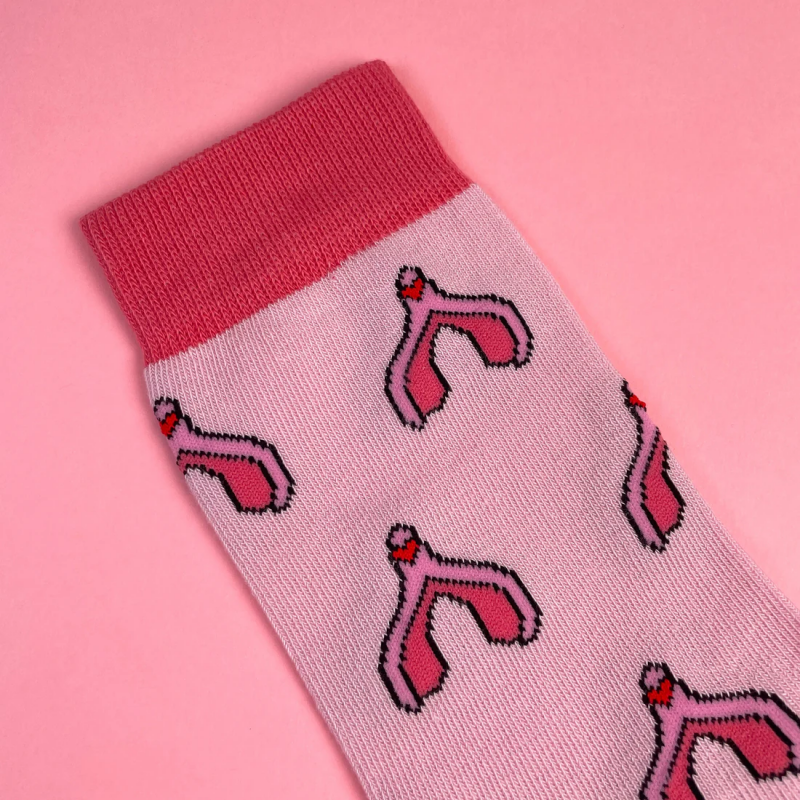 Laissons dépasser de nos sneakers ces jolies chaussettes roses féministes et rigolotes, à motif petit clito pour montrer nous aussi ce qu’on a entre les jambes.