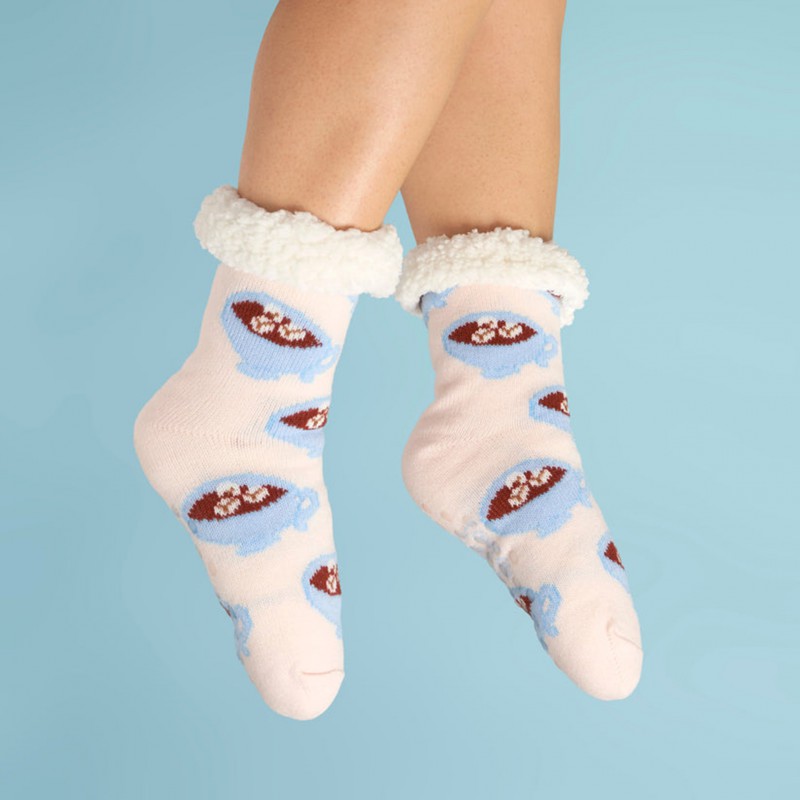 Rien de mieux qu’une paire de chaussons moelleux archi douillets pour rester à la maison bien au chaud devant un téléfilm à l’eau de rose. Et encore mieux si ces chaussons sont couverts de chocolats chauds au marshmallow ! Un motif original sur un fond rose pâle qui nous accompagne tous les week-ends et jours fériés.