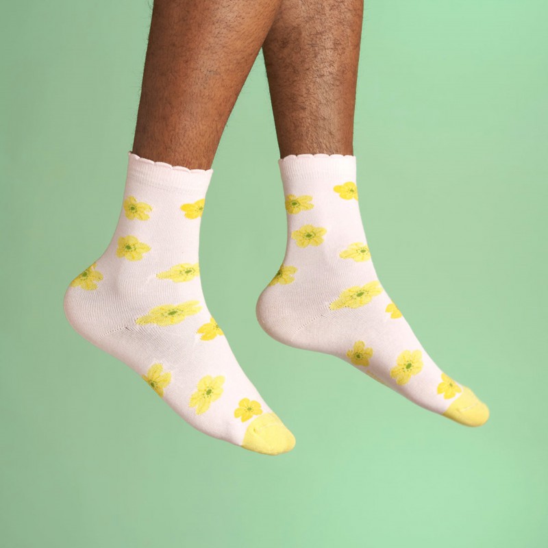 Pour satisfaire nos envies de balades champêtres, on enfile ces chaussettes originales à motif boutons d’or. Un parterre de jolies fleurs jaunes aux pistils verts pastel, le tout sur un fond crème rosé qui s’accorde à toutes les tenues. À deux doigts de sortir notre chapeau de paille…