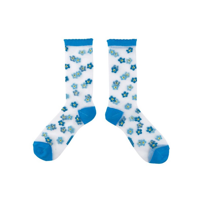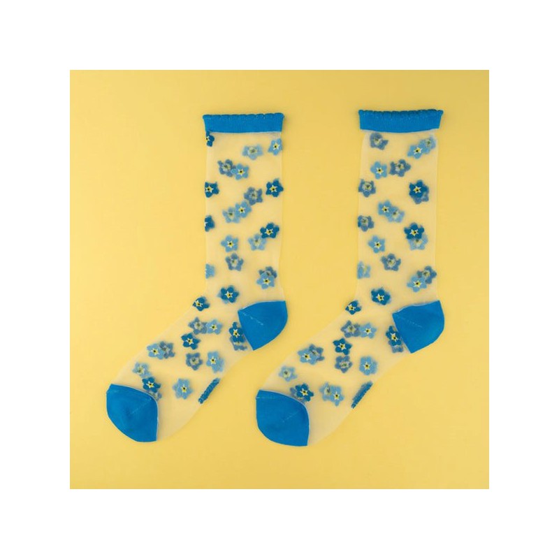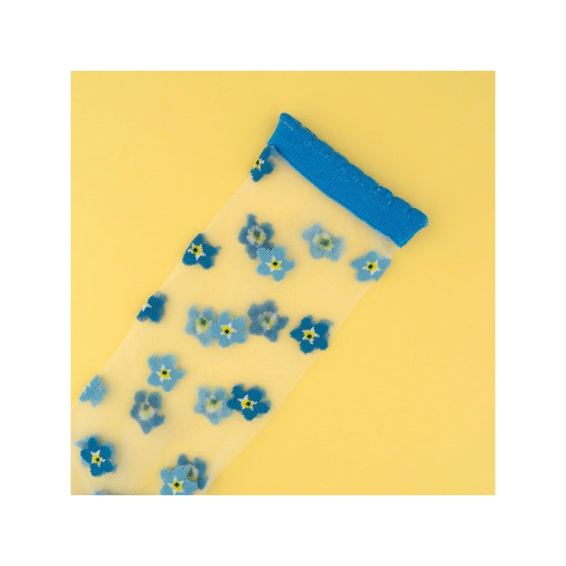 Des belles chaussettes transparentes à motifs, couvertes de Myosotis ! Ces jolies petites fleurs bleues seront du plus bel effet sur nos chevilles subtilement dénudées cet été. On adore la finition avec une fronce qui rappelle les pétales des fleurs, pour un look encore plus estival et romantique !