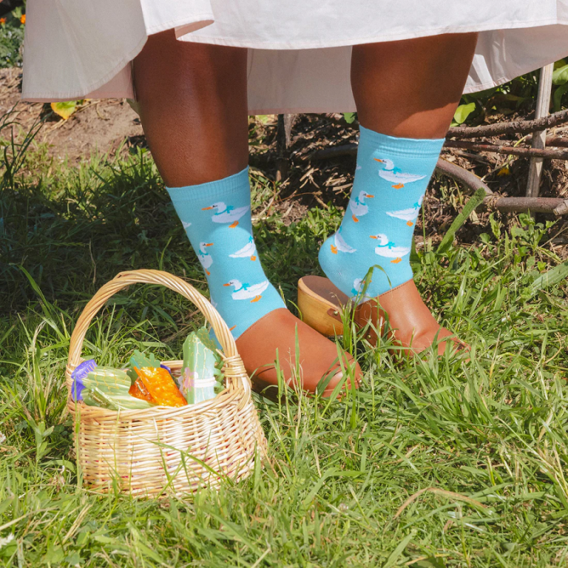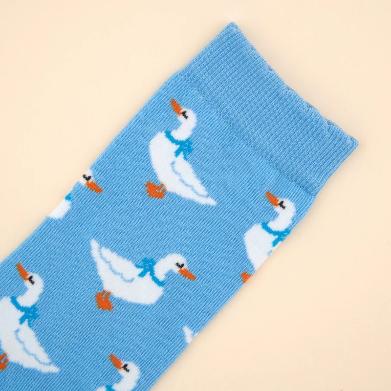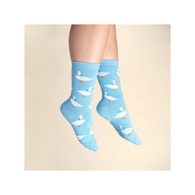 Françoise l’oie, nous suit au d-oie et à l'œil dans toutes nos balades oie-sives. Avec son joli nœud et son air court-oie, elle décore nos chaussettes bleues ciel avec la plus grande j-oie et protège nos petons du moindre coup de fr-oie.