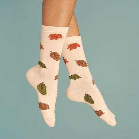Ces chaussettes à motif préférées de l’automne : ces petites beautés couvertes de feuilles de saison. Vertes, marrons ou orangées, mais toutes pailletées à souhait ! Le tout sur un fond crème pour ne pas leur voler la vedette.