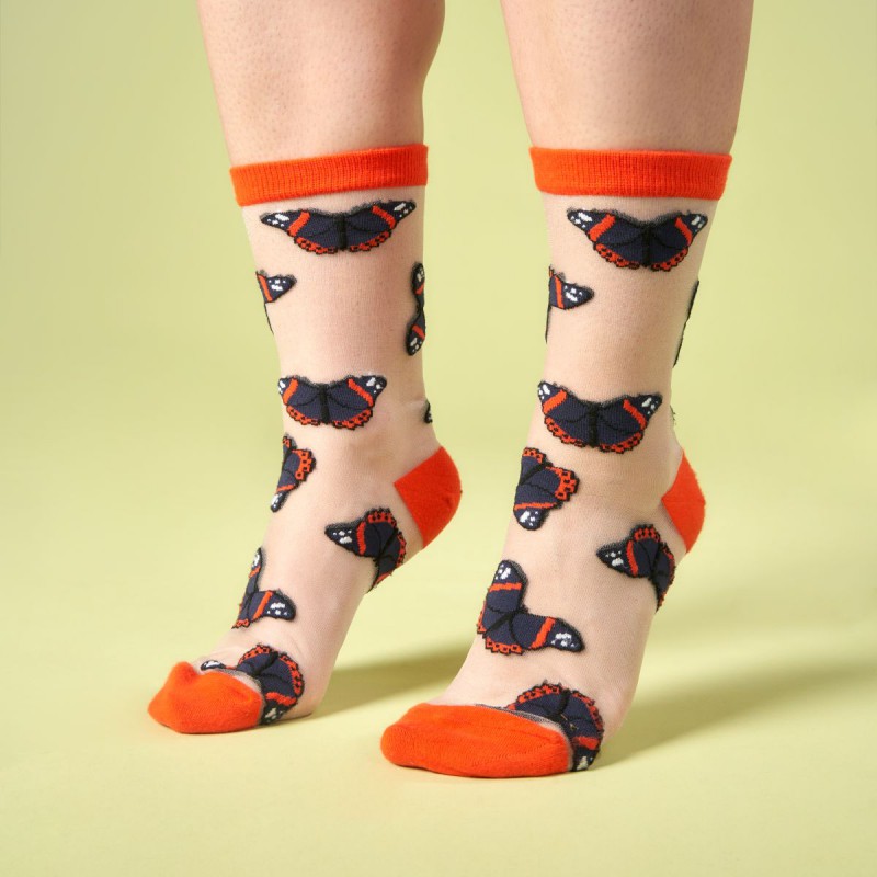 Des chaussettes transparentes façon collant, décorées de beaux papillons noir et orange ! On adore ces jolies bestioles qui se baladent sur nos chevilles, et les touches de rouge-orange vif aux extrémités qui ravivent nos tenues.