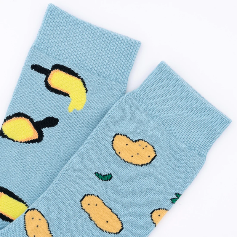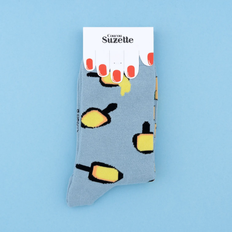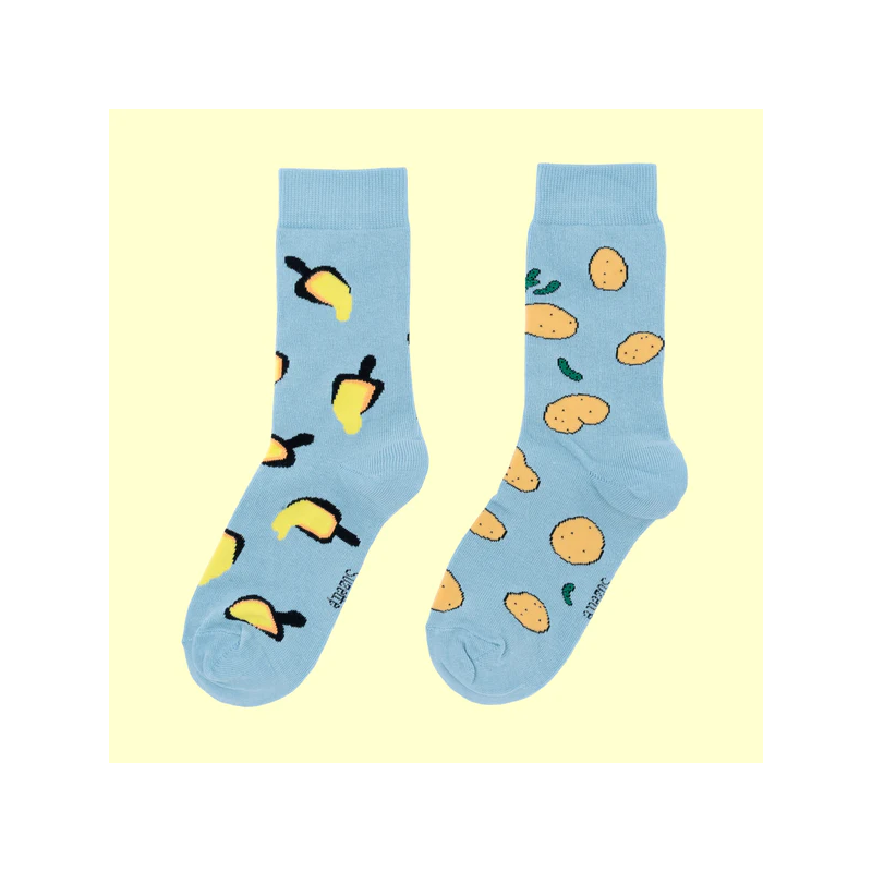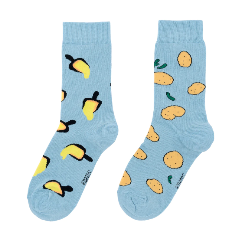 Chaussettes dépareillées à motif raclette, avec ses poêlons dégoulinants de fromage d’un côté et ses patates cornichons de l’autre pour assumer au grand jour son amour du fromage.