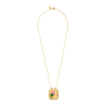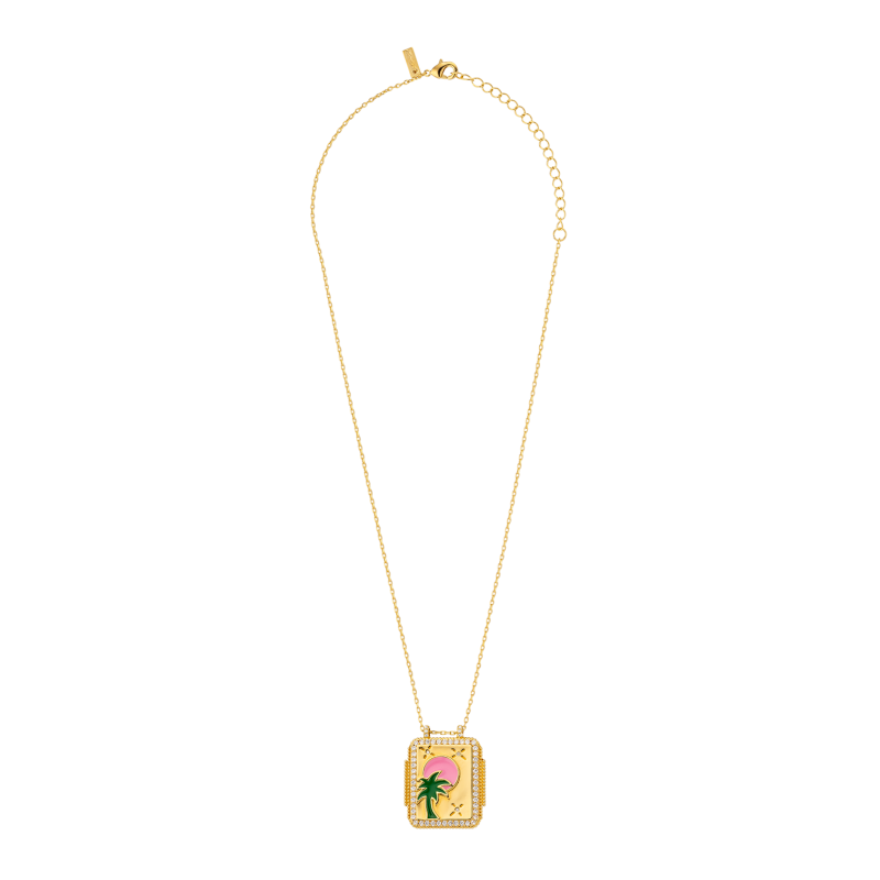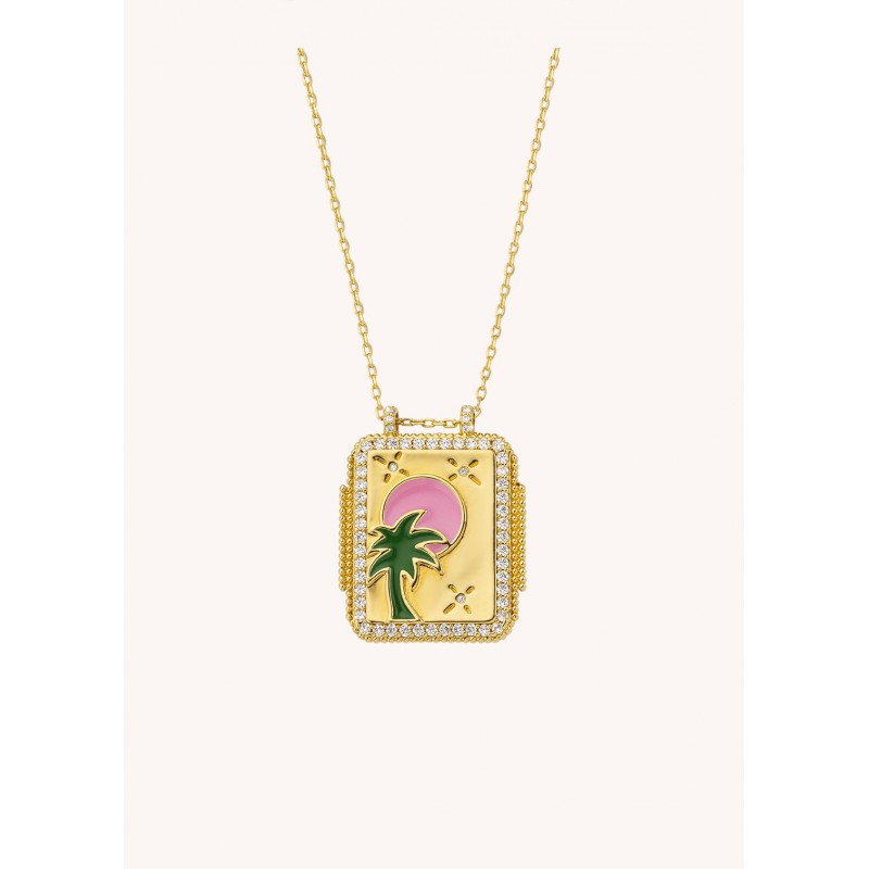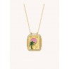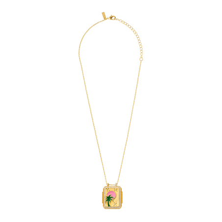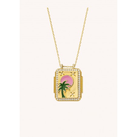 Le design carré et moderne est sublimé par une pierre semi-précieuse transparente et un palmier en émail vert, symbolisant l’évasion et la chaleur des tropiques.