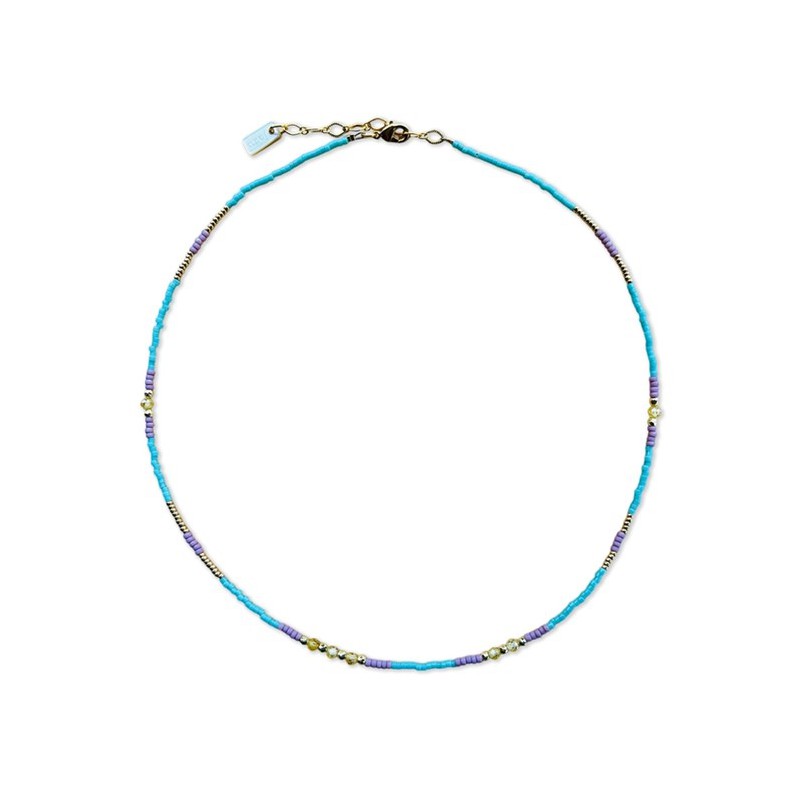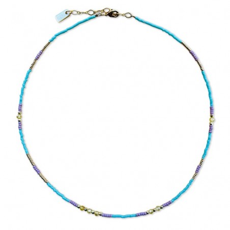 Collier de petites perles de verre serties de pierres semi-précieuses, fermoir et chaîne d'extension plaqués or, fait main.