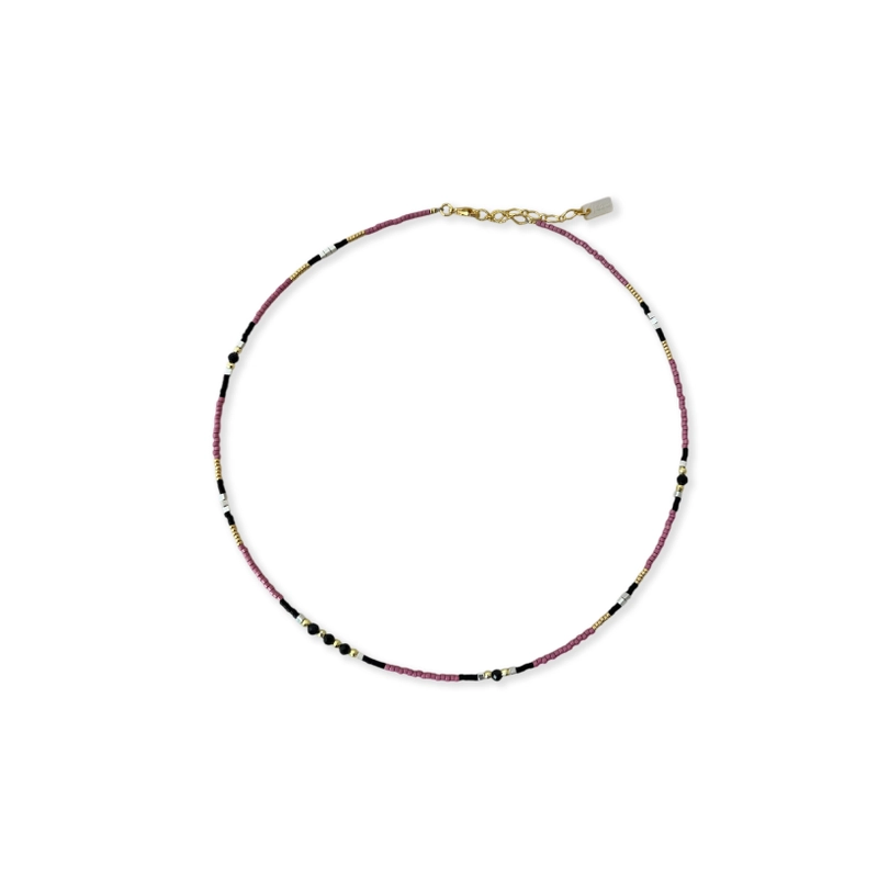 Collier de petites perles de verre serties de pierres semi-précieuses, fermoir et chaîne d'extension plaqués or, fait main.