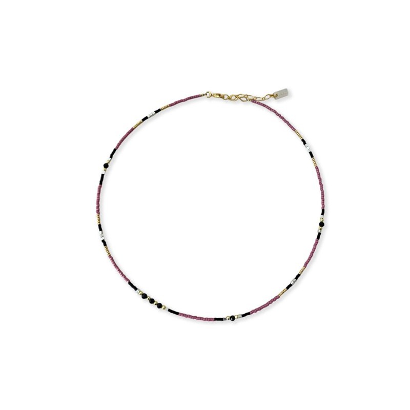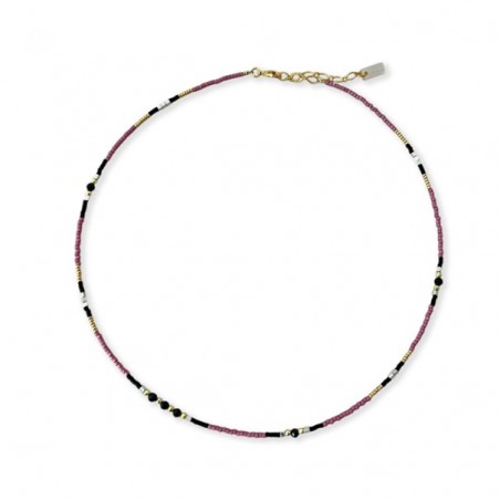 Collier de petites perles de verre serties de pierres semi-précieuses, fermoir et chaîne d'extension plaqués or, fait main.