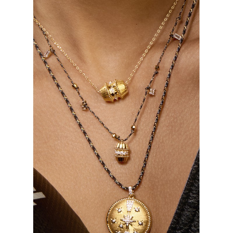Le collier TALISMAN LIBERTY de MYA—BAY, doré à l’or fin recyclé 24 carats, revisite notre TALISMAN iconique dans une version plus audacieuse.