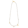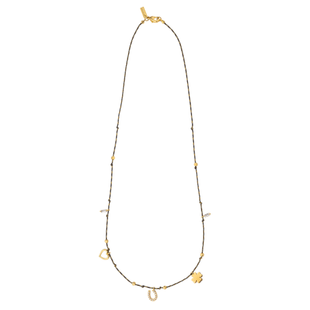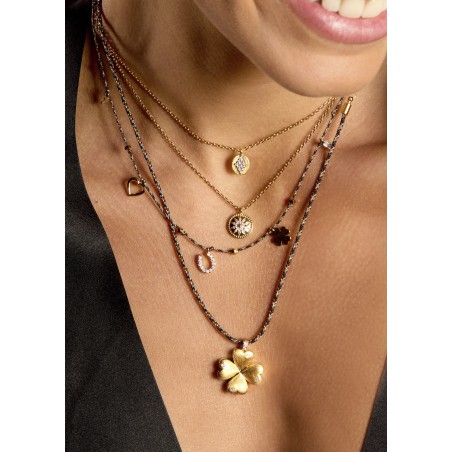 Le collier LUCKY LIBERTY de MYA—BAY, doré à l’or fin recyclé 24 carats, réunit en un seul bijou les 3 symboles porte-bonheur iconiques : un cœur, un fer à cheval et un trèfle à 4 feuilles.
