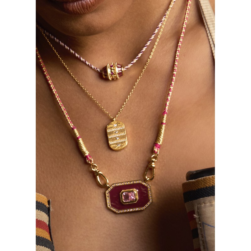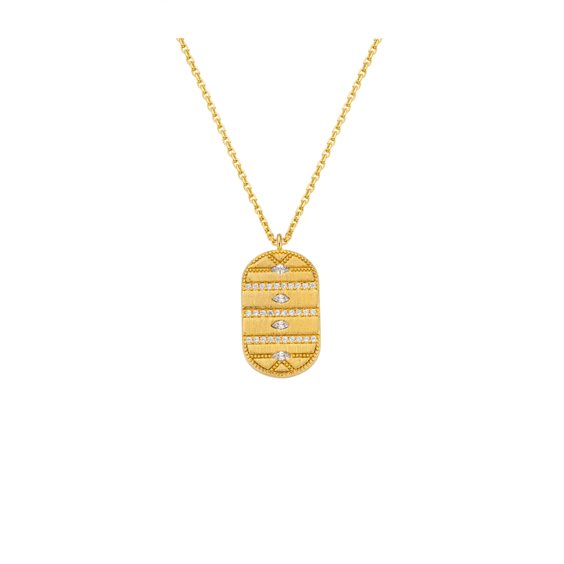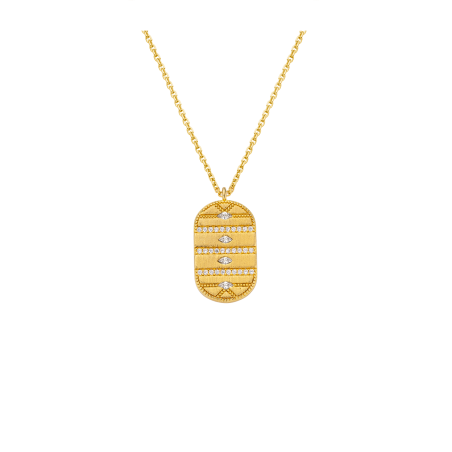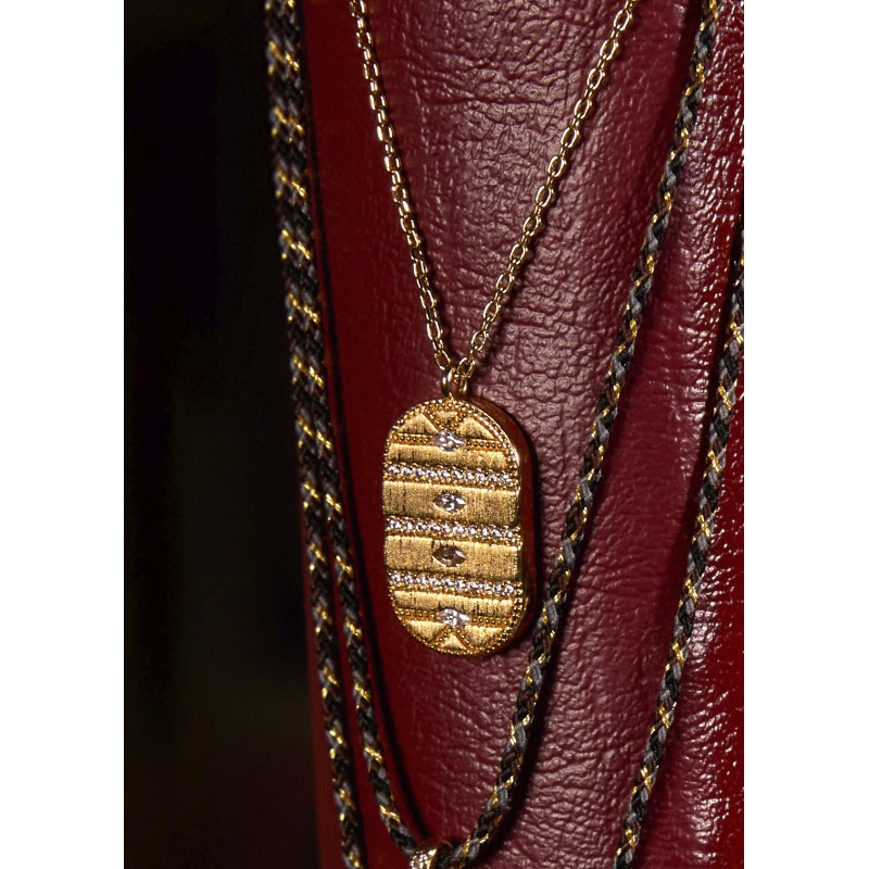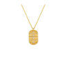 Le collier CODE de MYA—BAY, doré à l’or fin recyclé 24 carats, est une création au design symbolique, inspiré des codes mystérieux de l’Égypte ancienne.