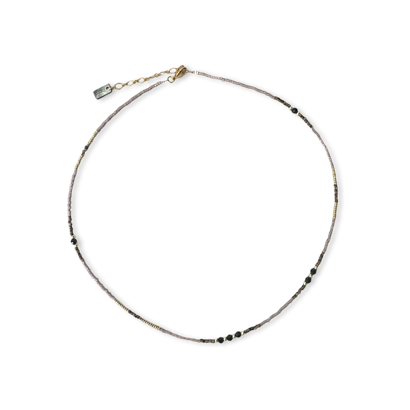 Collier de petites perles de verre serties de pierres semi-précieuses, fermoir et chaîne d'extension plaqués or, fait main.