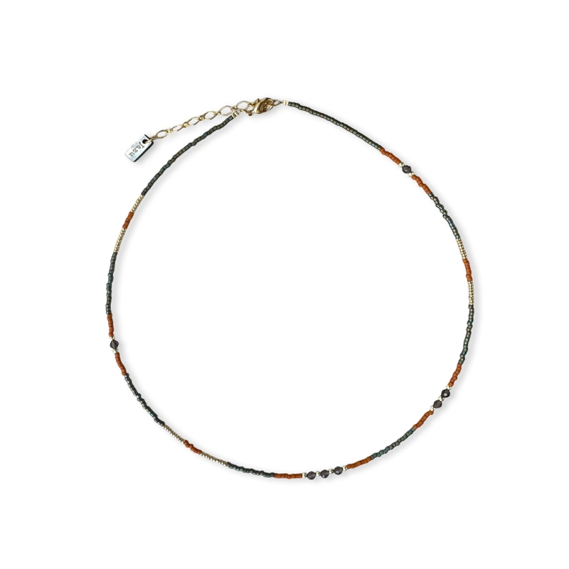 Collier de petites perles de verre serties de pierres semi-précieuses, fermoir et chaîne d'extension plaqués or, fait main.
