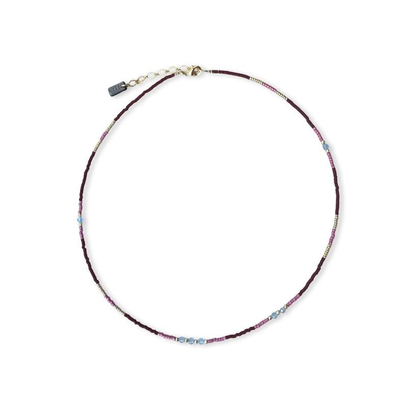 Collier de petites perles de verre serties de pierres semi-précieuses, fermoir et chaîne d'extension plaqués or, fait main.
