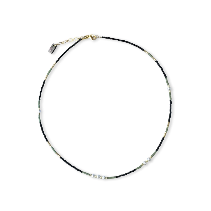 Collier de petites perles de verre serties de pierres semi-précieuses, fermoir et chaîne d'extension plaqués or, fait main.