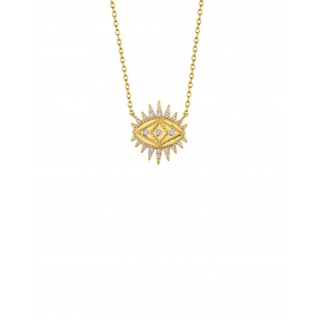 Son pendentif en œil ouvert, délicatement travaillé sur une chaîne fine, capte la lumière et l’imagination.