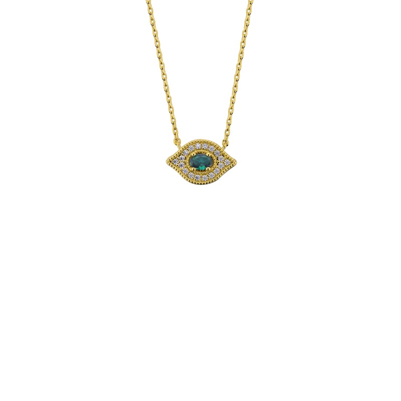 Le collier GREEN MAJESTIC EYE de MYA—BAY, doré à l’or fin recyclé 24 carats, attire tous les regards avec sa pierre verte vibrante entourée de zircons éclatants.