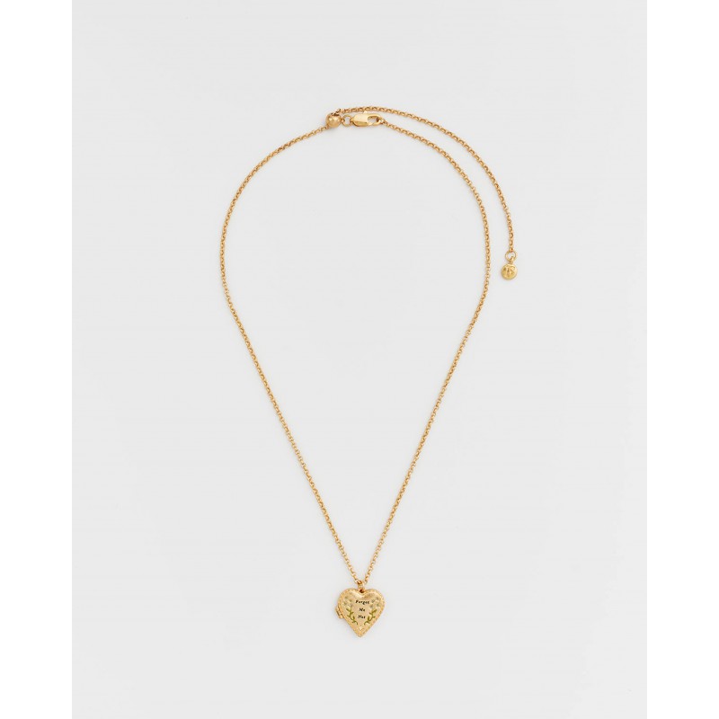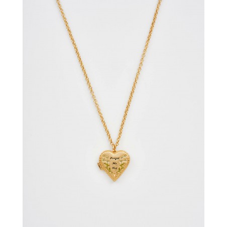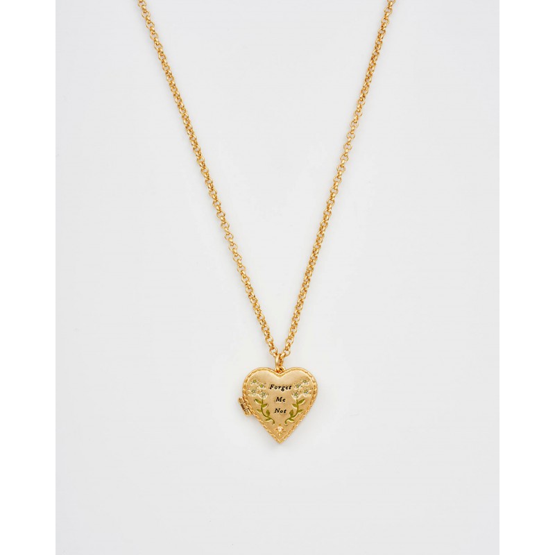Délicat et empreint de tendresse, le collier médaillon Cœur Floral en Or est un bijou précieux. Des fleurs en émail peintes à la main et une perle d'imitation brillante ornent le devant, gravé du message tendre « Ne m'oubliez pas ». Confectionné en plaqué or 22 carats vieilli, ce médaillon à charnière s'ouvre pour accueillir une petite photo ou un souvenir précieux près du cœur.