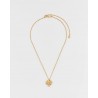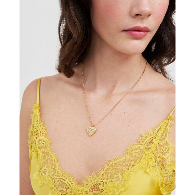 Pendentif : Laiton plaqué or 22 carats vieilli, alliage de zinc, émail, perle Chaîne : Laiton plaqué or 22 carats usé
