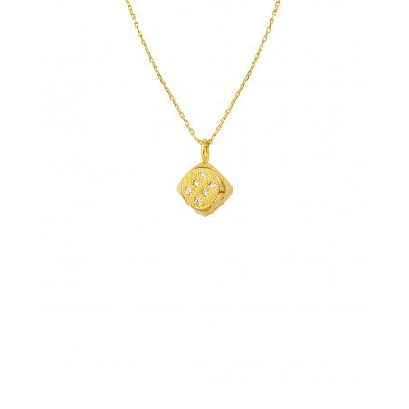 Le collier GAME de MYA—BAY affiche un design audacieux et résolument moderne. Inspiré de la forme d’un dé, son pendentif en or brossé joue sur les contrastes de textures : des faces mates en or brossé, sublimées par des arêtes légèrement arrondies et brillantes. Un bijou graphique et original, qui capte la lumière et attire le regard avec subtilité.