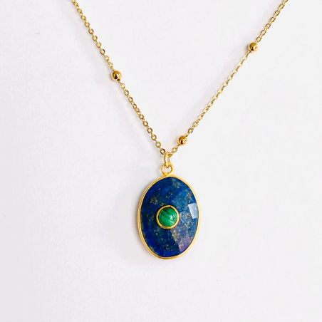 Découvrez l’élégance raffinée du Collier Elvis, doré à l'or fin et composé de pierres naturelles, lapis Lazuli et malachite. Sa chaîne délicate, ajustable de 45 à 50 cm, sublime chaque tenue avec grâce et sophistication.