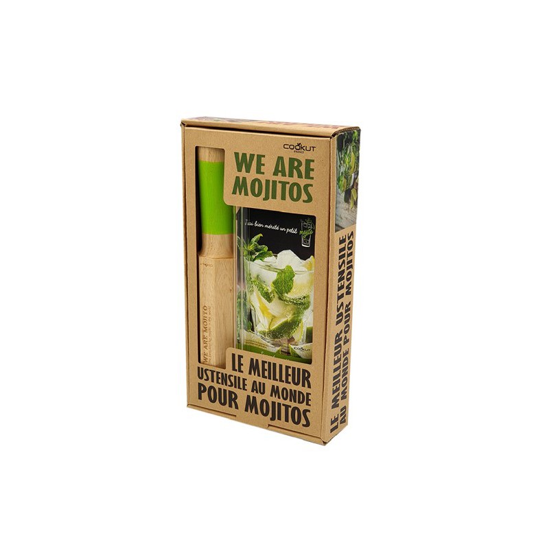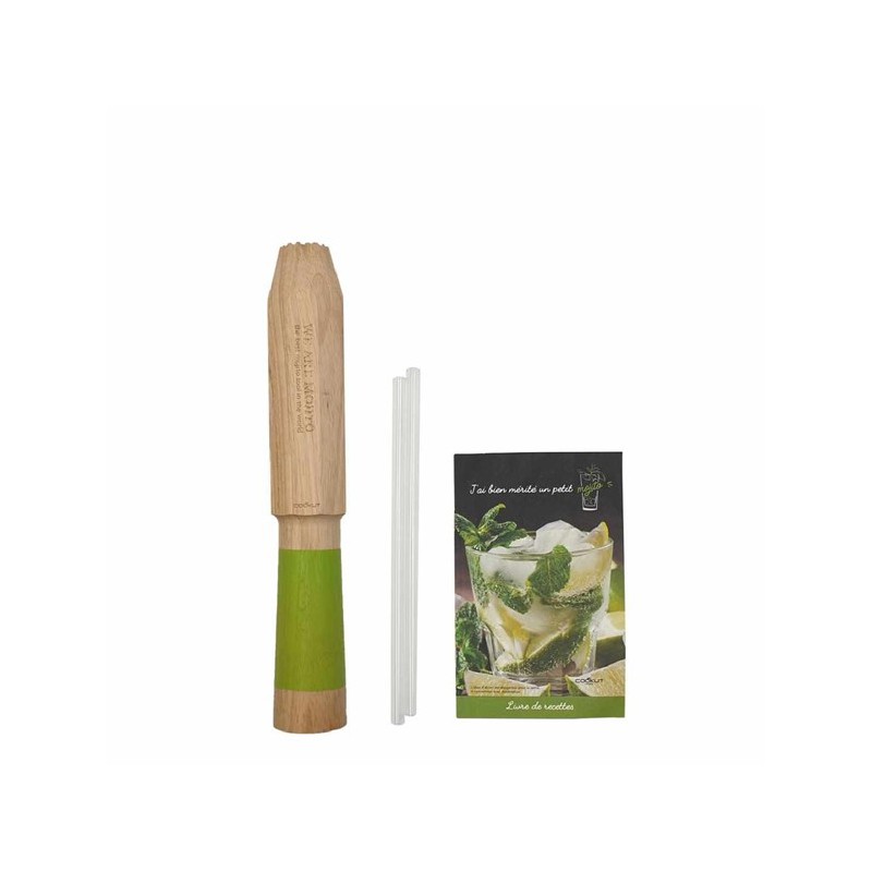 L'ustensile unique au monde 4 en 1 avec ses pailles en verre et son livre de recettes pour des mojitos toujours parfaitement dosés.