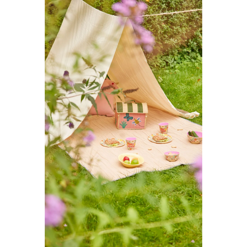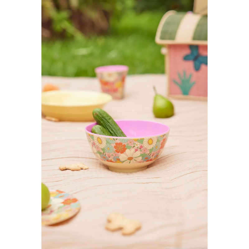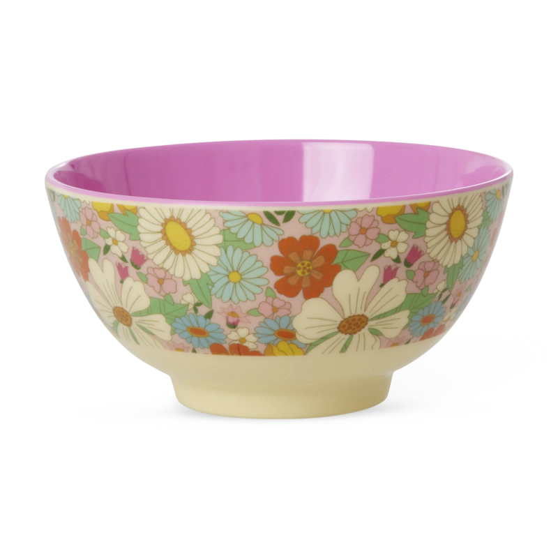 Superbe bol en mélamine, taille médium, imprimé « Flower Power » – un motif fleuri avec un intérieur rose vitaminé. La mélamine est durable et idéale au quotidien grâce à sa solidité et à sa facilité de nettoyage. Elle ne s’imprègne ni des odeurs ni de la couleur des aliments – ce qui rend ce bol à la fois fun et pratique ! Veuillez noter qu’il est parfait pour les batônnets de légumes comme pour les encas, mais qu’il ne passe pas au micro-ondes.