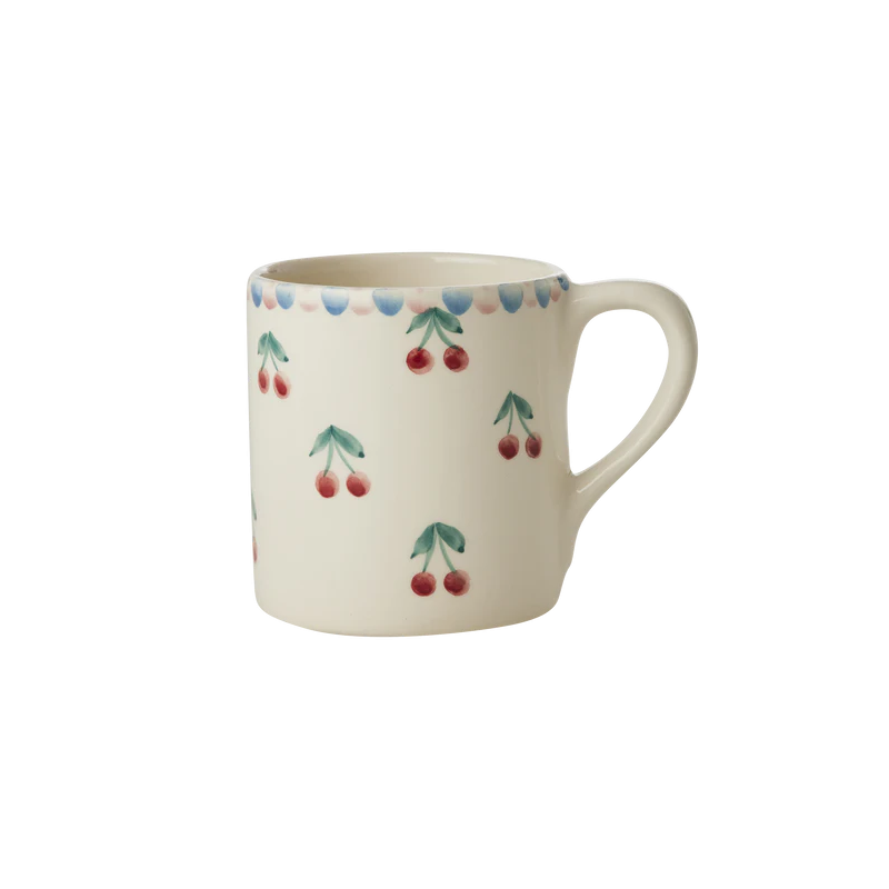 Magnifique mug pour le café avec de jolies cerises. Peint à la main au Portugal par un groupe de femmes extraordinaires, c’est une pièce vraiment unique et remplie de charme !