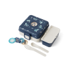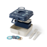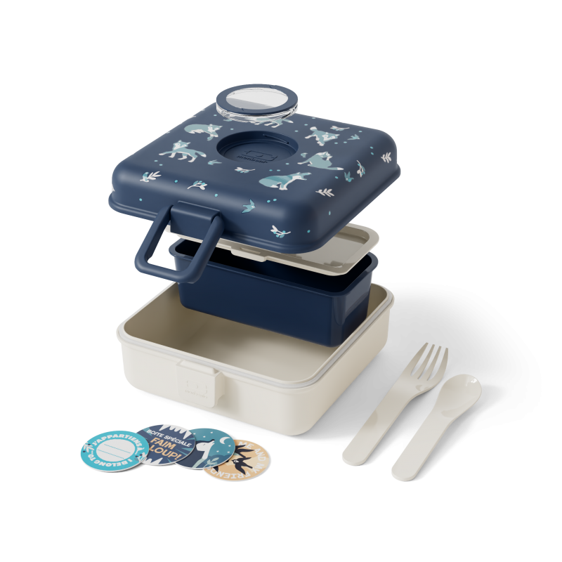 Avec la lunch box Snacky, ce n'est pas un estomac qui gargouille qui arrêtera les enfants dans leurs folles aventures ! Son format généreux et plat de 850 ml permet de transporter et protéger un sandwich, une brique de jus de fruits, une gourde de compote, des cookies ou tout autre encas préféré des minis aventuriers. Une fourchette et une cuillère sont disponibles sous le couvercle de cette boite à goûter pour permettre aux enfants de profiter pleinement de leur repas. Une caissette amovible avec couvercle est également incluse pour faciliter l'organisation des différents aliments. En plus d'être facile à ouvrir et fermer pour les enfants, cette boite à sandwich peut être personnalisée grâce aux 4 vignettes incluses, interchangeables sur le couvercle de la boite. Dites au revoir aux sandwiches en miettes au fond du cartable !