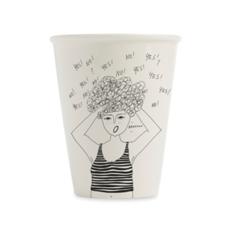 Caractéristiques Fait main Hauteur : 9,5 cm Diamètre : ø 8 Volume : 220 ml Couleur : dessin au trait noir sur fond blanc cassé Matériau : porcelaine, céramique, transfert