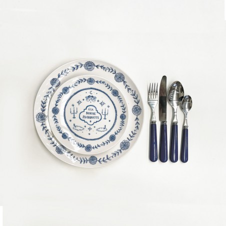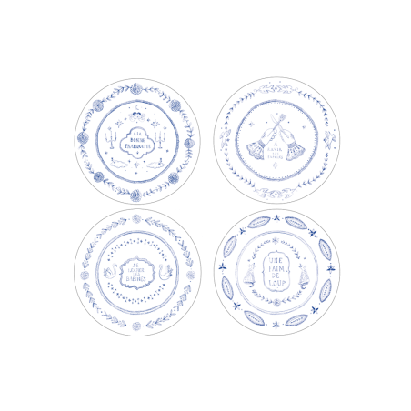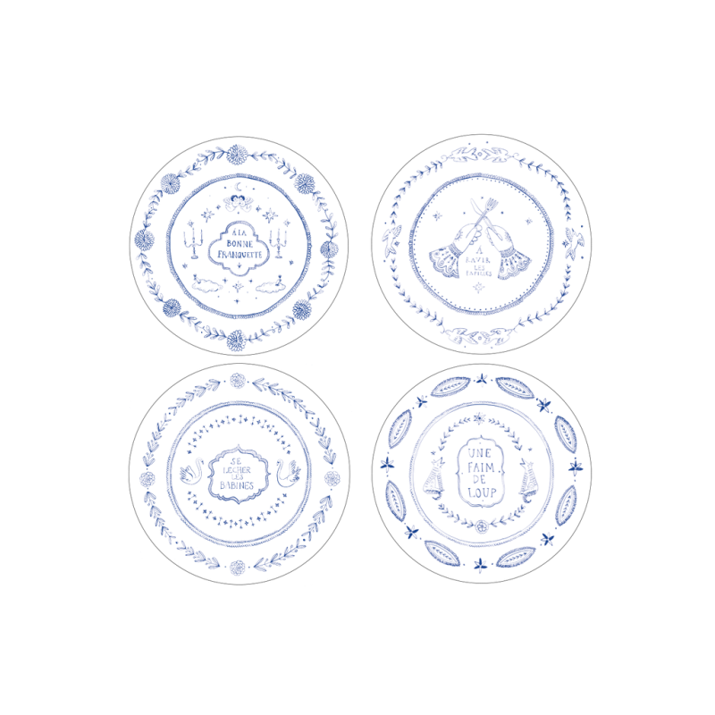 Ce set de 4 assiettes dessert met à l’honneur des expressions savoureuses : À la bonne franquette, Une faim de loup, À ravir les papilles, Se lécher les babines, illustrées d’un trait bleu profond. Un design aussi expressif que convivial, pour des repas pleins de caractère. Un clin d’œil gourmand à la culture française, en collaboration avec une jeune artiste franco-londonienne, aussi charmante que ses illustrations.