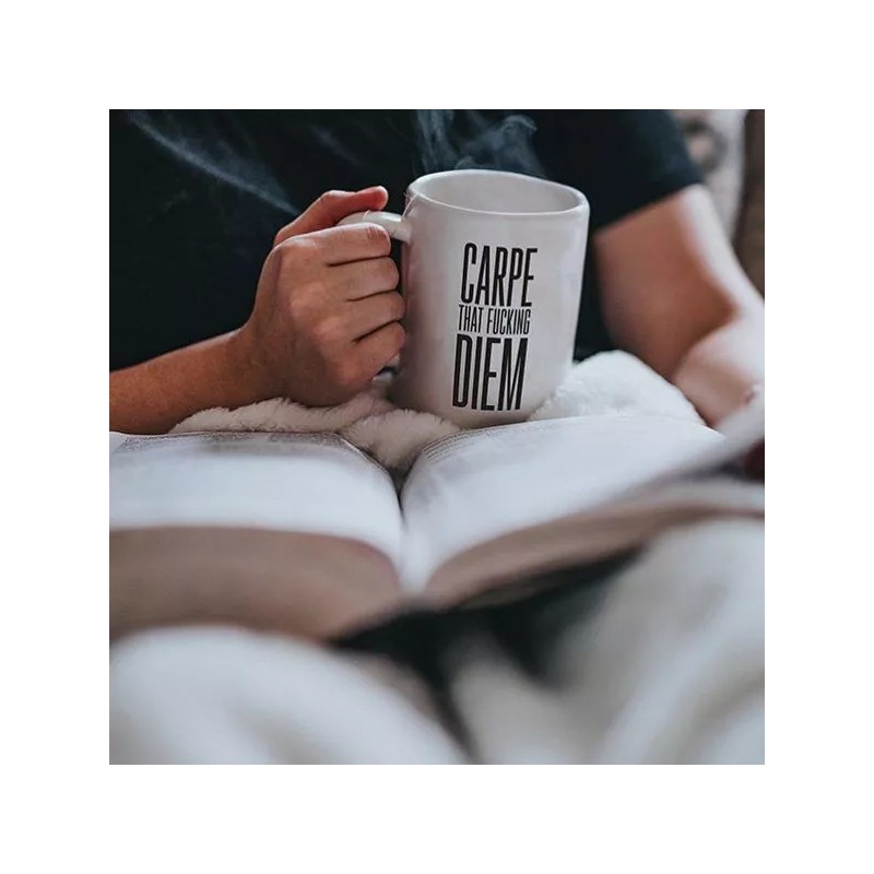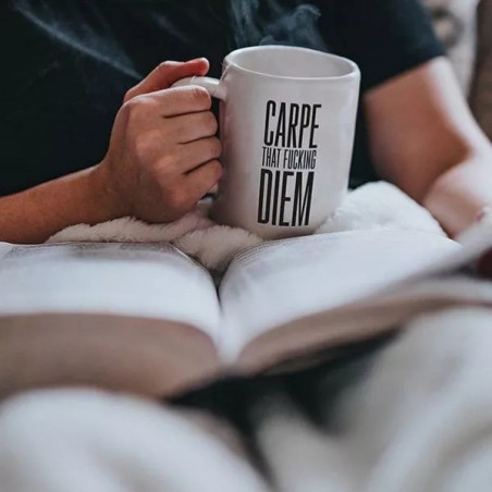 Le mantra ultime pour ceux qui ne font pas dans la demi-mesure ! Ce mug arbore fièrement le message "CARPE THAT FUCKING DIEM" dans une typographie noire, haute et percutante. C'est l'objet indispensable pour transformer la routine du petit-déjeuner en une véritable prise de pouvoir sur la journée.