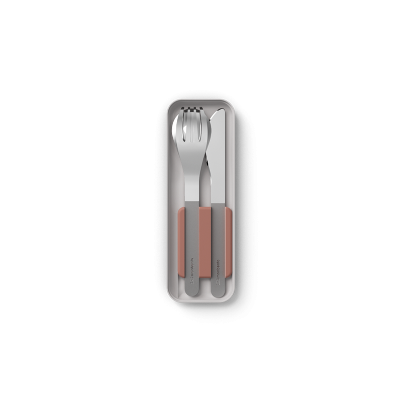 - MB Original : superposer la fourchette sur la cuillère et les glisser dans un des emplacements du support de maintien, logo monbento visible. Positionner le couteau dans le second emplacement, logo monbento visible.