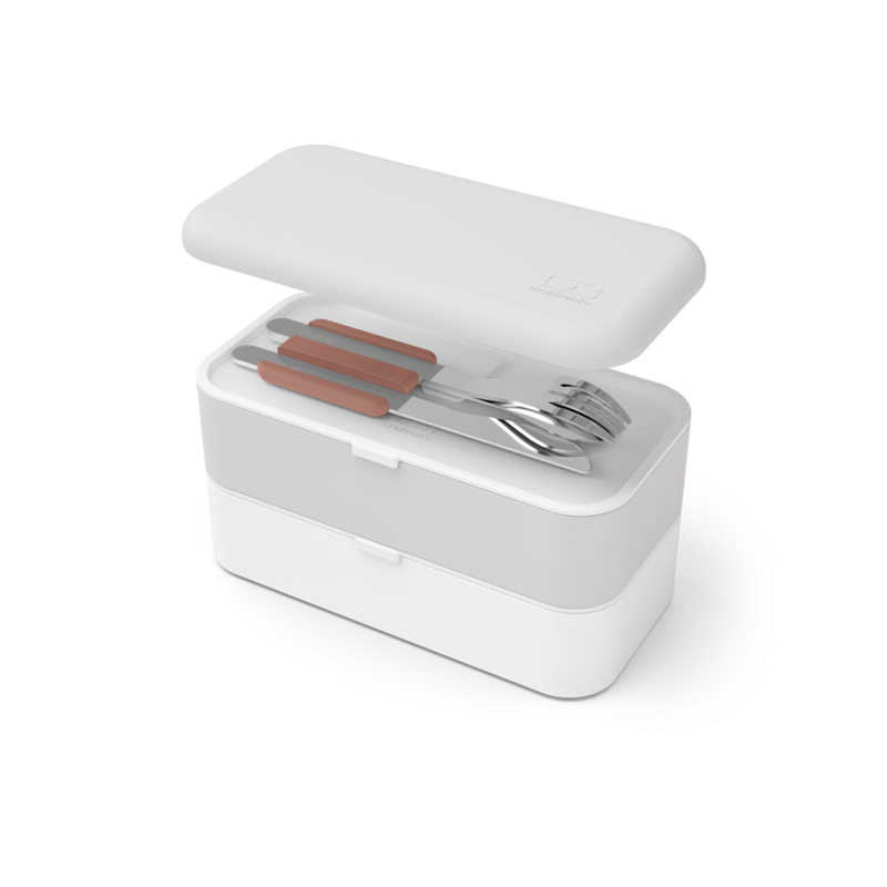 - MB Square : superposer dans l'ordre : le couteau en-dessous, la cuillère au milieu et la fourchette au dessus, et glisser les 3 pièces dans l'un des emplacements du support de maintien, logo monbento visible.