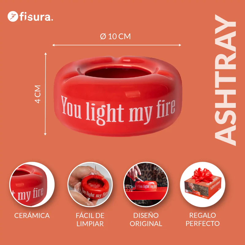 Si vous ne pouvez résister à l'envie d'allumer une autre cigarette, ce cendrier rond avec le message « You light my fire, another one ?» est fait pour vous. Ses trois encoches vous permettent de garder votre maison sans cendres avec une touche d'humour lors de vos fêtes et réunions entre amis. Et si vous n'êtes pas fumeur… vous pouvez l'utiliser pour jeter papiers, chewing-gums, mégots et même noyaux d'olives !
