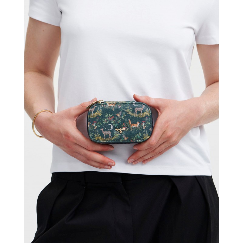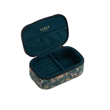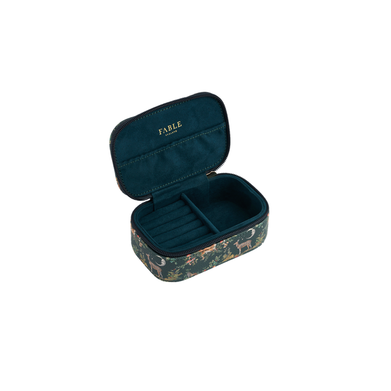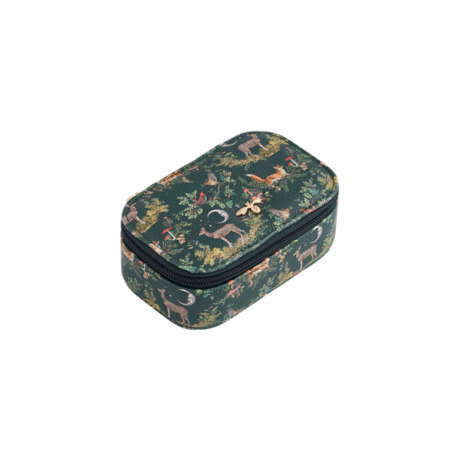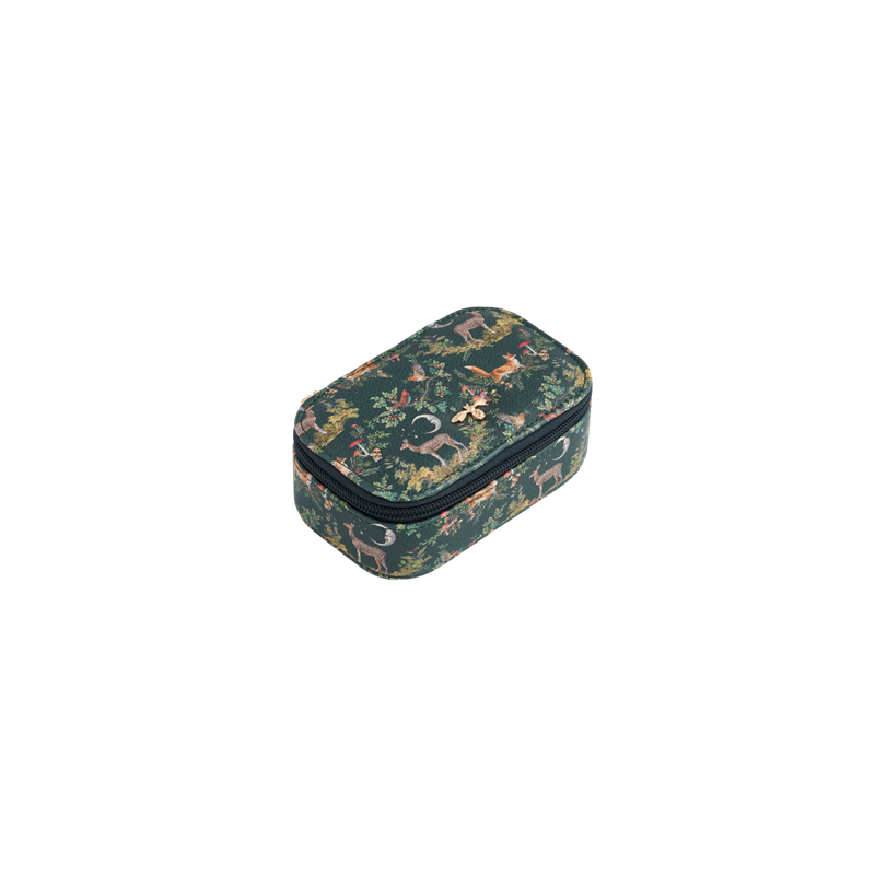 Que vous partiez en voyage ou que vous ayez simplement besoin d'un endroit sûr pour vos précieux bijoux, cette boîte à bijoux est la solution. Fantaisiste et merveilleux, l'imprimé forêt met en scène la renarde, la biche et la chouette sous la lumière du croissant de lune, tandis que de délicats champignons rouges ajoutent une touche de couleur à la magie de minuit. Un ajout charmant à votre commode, mais aussi pratique à transporter.